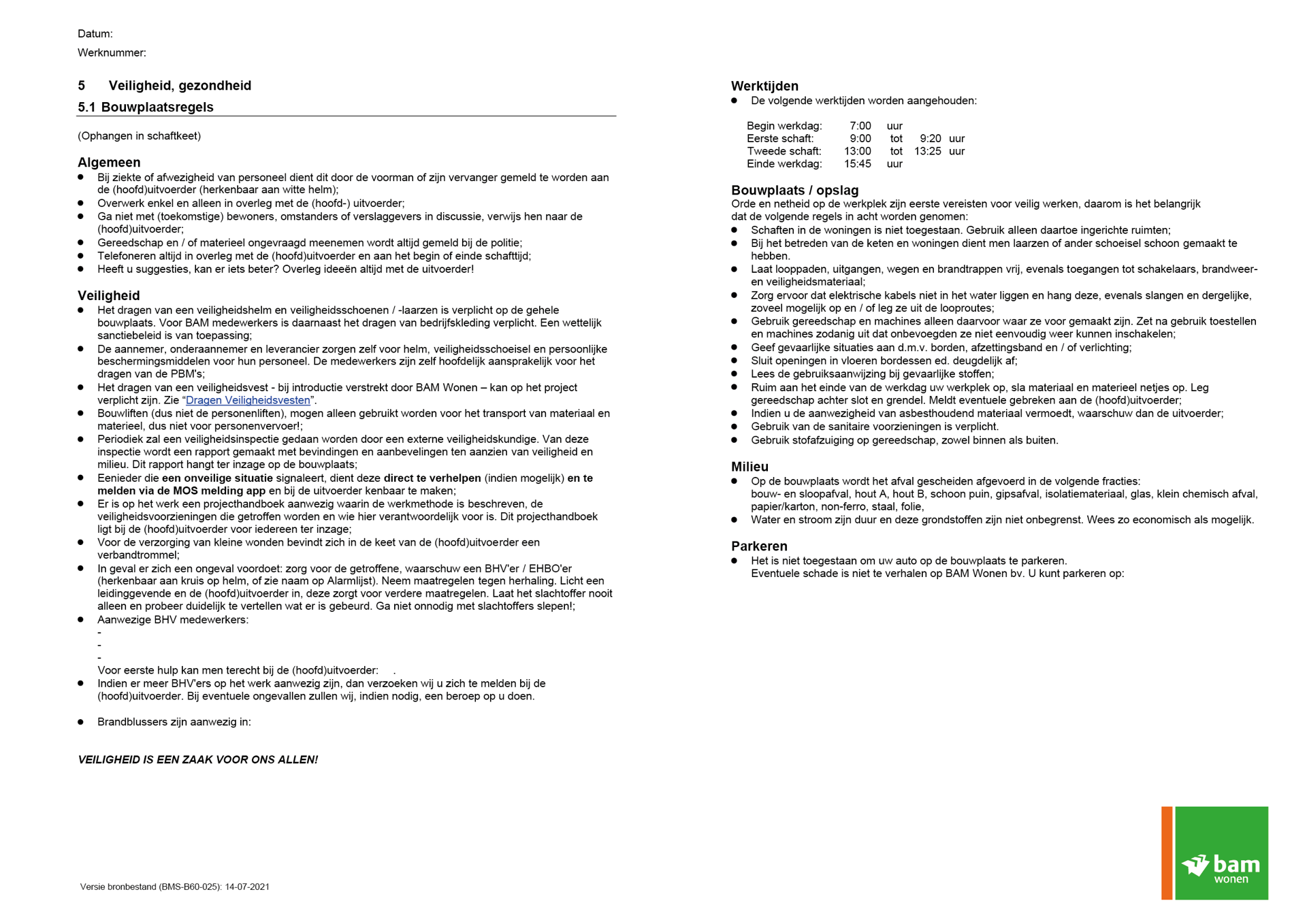 Bouwplaatsregels ophangen in de keet.
