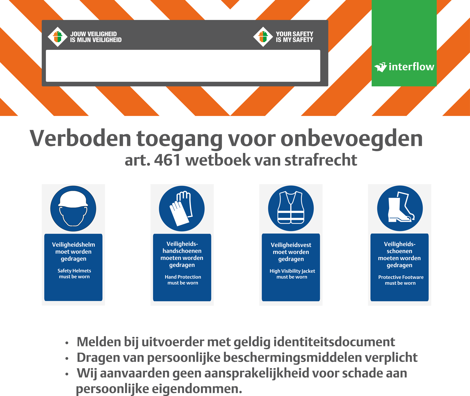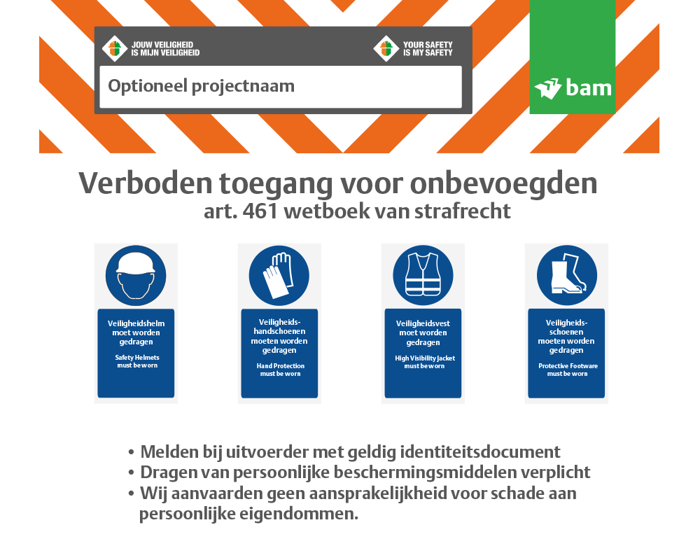 • In- en uitgangen project. Minimale PBM’s: Helm + veiligheidsschoenen (BBT: + handschoenen).