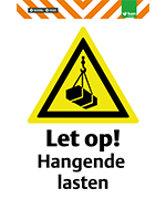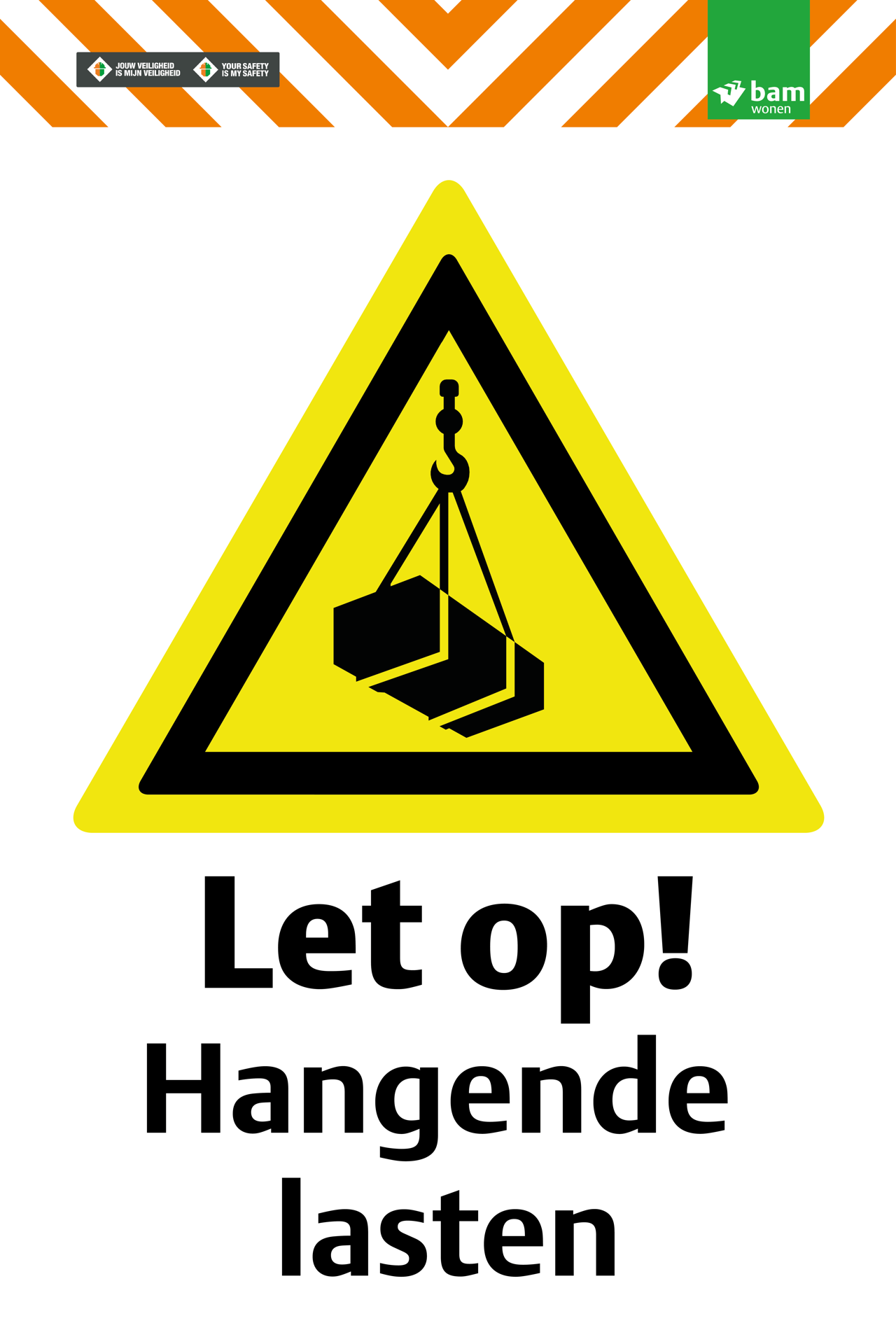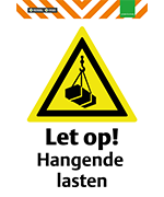 Markering gevaar vallende lasten rondom hijsgebied d.m.v. rood-wit lint en waarschuwingsbord.